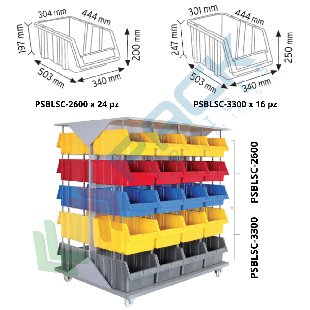 Carrello portaminuteria fornito completo di 40 cassette in plastica bocca di lupo modello sovrapponibile e componibile con Mis. esterne 1400 L x 1040 P x 1600 H mm. Il carrello per cassette ha 4 ruote alla base e ha una struttura in metallo e legno. Il carrello è completo di 24 cassette 26 Lt Mis. 340 L x 503 P x 200 H mm (Cod. Art. PSBLSC-2600) + 16 cassette 33 Lt Mis. 340 L x 503 P x 250 H mm (Cod. Art. PSBLSC-3300). Le cassette bocca di lupo sono ideali per lo stoccaggio di piccoli componenti; Rappresentano infatti la soluzione ideale per tutte le esigenze di magazzinaggio per ferramenta, officine e magazzino come portaminuteria. Il lato frontale aperto del contenitore portaminuteria rende facilmente accessibili i componenti al suo interno. Pratico carrello con tettoia ideale per il magazzinaggio mobile, con cassette posizionate su due lati. Fornito già montato.