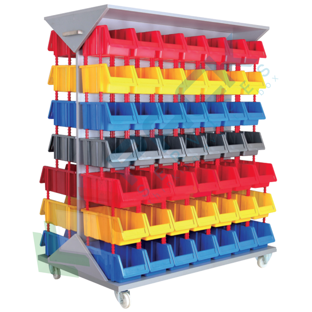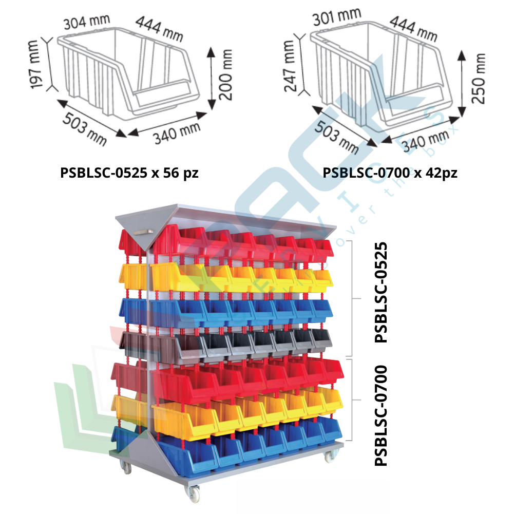 Carrello portaminuteria fornito completo di 98 cassette in plastica bocca di lupo modello sovrapponibile e componibile con Mis. esterne 1260 L x 820 P x 1660 H mm. Il carrello per cassette ha 4 ruote alla base e ha una struttura in metallo e legno. Il carrello è completo di 56 cassette 5,25 Lt Mis. 173 L x 307 P x 150 H mm (Cod. Art. PSBLSC-0525) + 42 cassette 7 Lt Mis. 173 L x 402 P x 150 H mm (Cod. Art. PSBLSC-0700). Le cassette bocca di lupo sono ideali per lo stoccaggio di piccoli componenti; Rappresentano infatti la soluzione ideale per tutte le esigenze di magazzinaggio per ferramenta, officine e magazzino come portaminuteria. Il lato frontale aperto del contenitore portaminuteria rende facilmente accessibili i componenti al suo interno. Pratico carrello con tettoia ideale per il magazzinaggio mobile, con cassette posizionate su due lati. Fornito già montato.