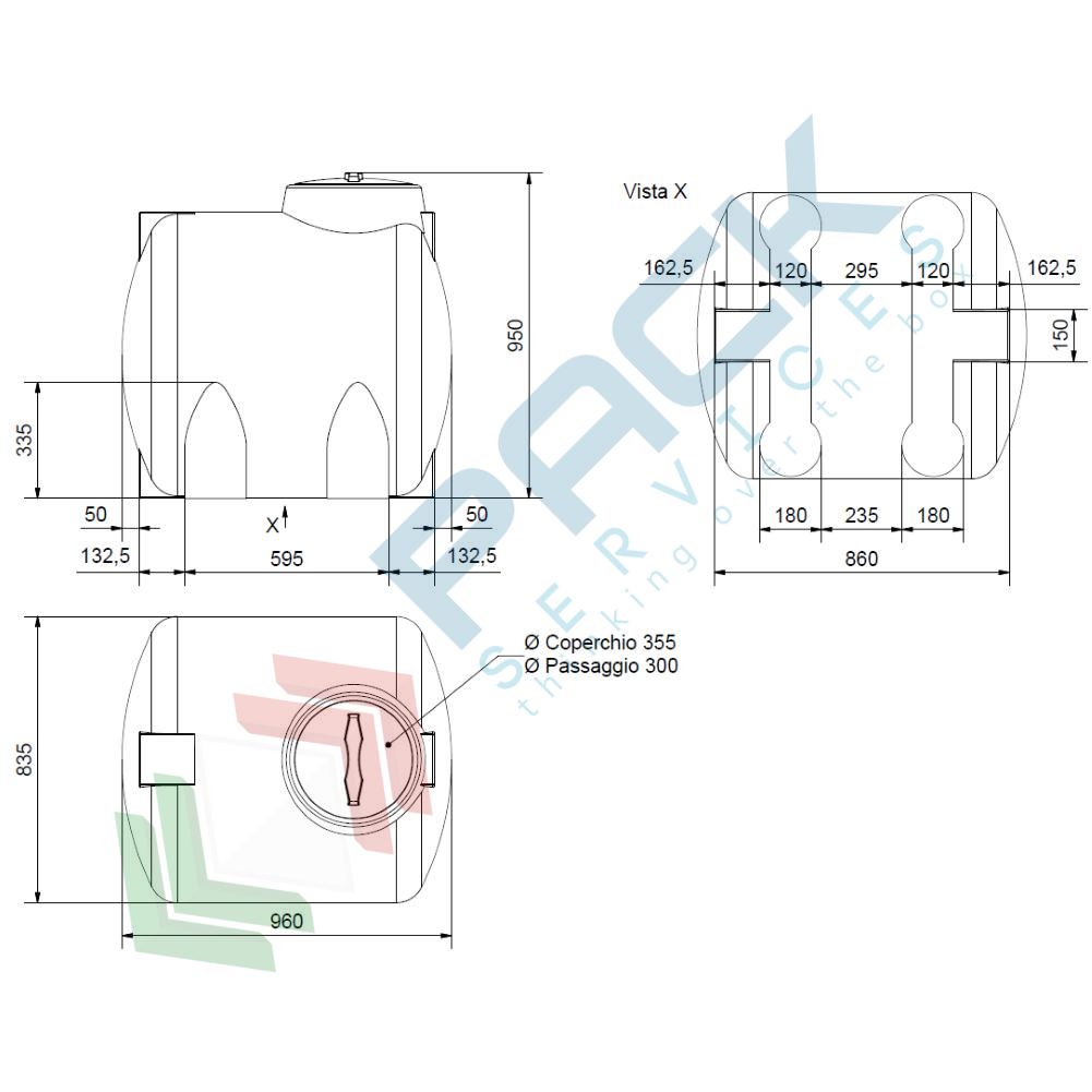 Serbatoio per acqua in polietilene, cilindrico orizzontale con piedi d'appoggio arrotondati, capacità 470 Litri, Mis. 835 L x 960 P x 980 H mm, con struttura auto-portante, con tasche piane per il posizionamento di eventuali attacchi, bocchelli, valvole e coperchio con sfiato incorporato. Serbatoio stoccaggio acqua realizzato in plastica (PE) polietilene atossico stabilizzato U.V. per una maggiore protezione dagli agenti atmosferici. Serbatoio acqua potabile monolitico, ovvero stampato in un unico pezzo senza giunzioni, destinato allo stoccaggio di acqua a pressione atmosferica a temperature comprese tra -30 °C e +50 °C. Serbatoio polietilene che può essere appoggiato direttamente su superfici piane continue, lisce, non cedevoli di adeguata portata al carico. Colore azzurro.