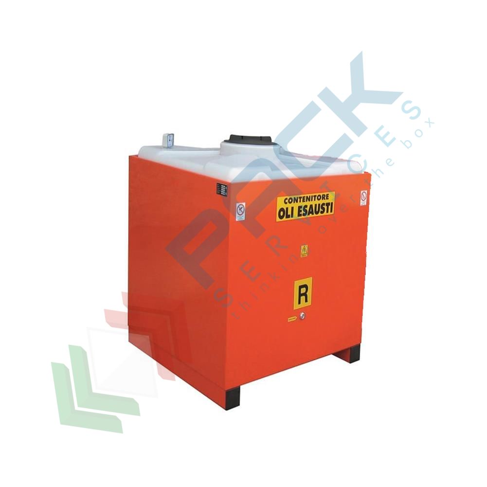 Contenitore per lo stoccaggio di oli esausti su 4 piedi senza coperchio, capacità 1000 Lt, mis. 1135 L x 1135 P x 1230 H mm. Stazione di stoccaggio praticissima e sicura nella gestione temporanea degli oli usati e dei fluidi alimentari, offre all'utente la soluzione più idonea alle proprie esigenze di raccolta, non solo in contesti industriali, ma anche in quelli relativi al settore alimentare e della ristorazione. Il contenitore di stoccaggio dispone di bacino esterno a tenuta stagna costruito in acciaio al carbonio da 3 mm e contenitore interno a tenuta stagna con boccaporto di carico a chiusura filettata, realizzato a stampaggio unico in polietilene stabilizzato U.V. per una maggiore protezione dagli agenti atmosferici. Colore arancio RAL 2004. In conformità alla normativa D. M. n. 392 del 16/05/1996 (regolamento recante norme tecniche relative alla eliminazione degli olii esausti) non può essere dotato di ruote.
