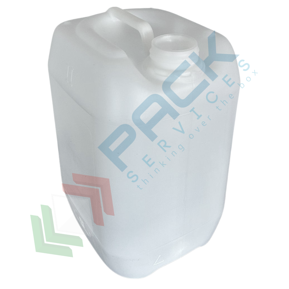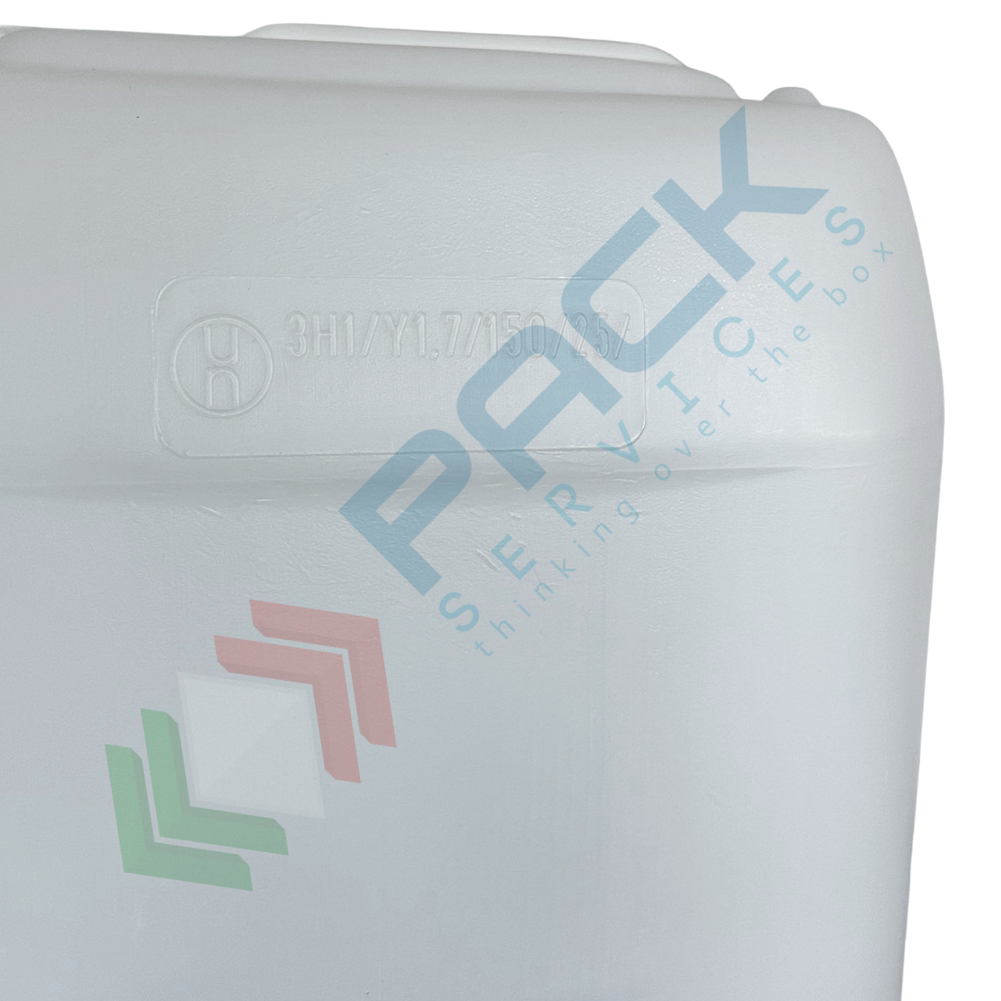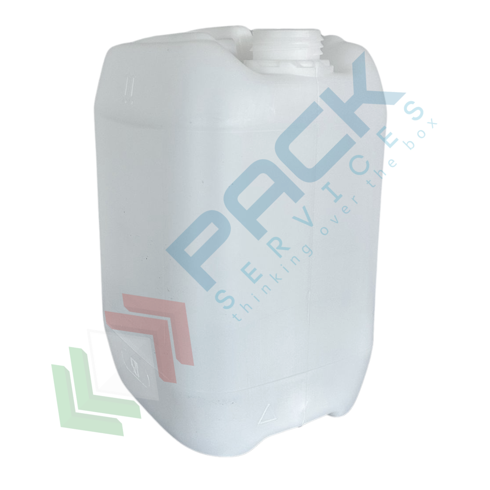 Tanica in plastica (HDPE), capacità 25 Lt, per alimenti, rettangolare, sovrapponibile e omologata ADR/ONU, peso 1100 gr, colore neutro - chiusura con tappo a vite con sigillo escluso