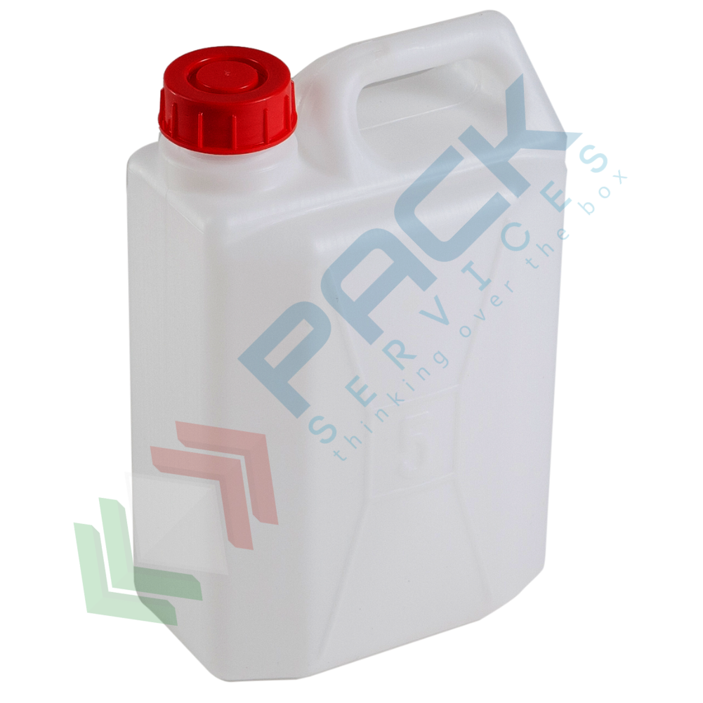 Tanica in plastica standard, realizzata in polietilene alta densità (HDPE), capacità 5 Lt, peso 270 grammi, Mis. 200 L x 120 P x 300 H mm, con comoda maniglia per il trasporto. Tanica acqua di forma rettangolare, con tappo a vite che fornisce massima protezione del contenuto. La tanica permette di trasportare e stoccare grandi quantità di liquidi come olio, acqua, vino, bibite, liquidi in generale. Il canestro in plastica è idoneo al contatto alimentare. Tanica robusta e resistente ai colpi, colore neutro. La bocca della tanica da 5 litri ha il diametro interno di 4.5 cm.