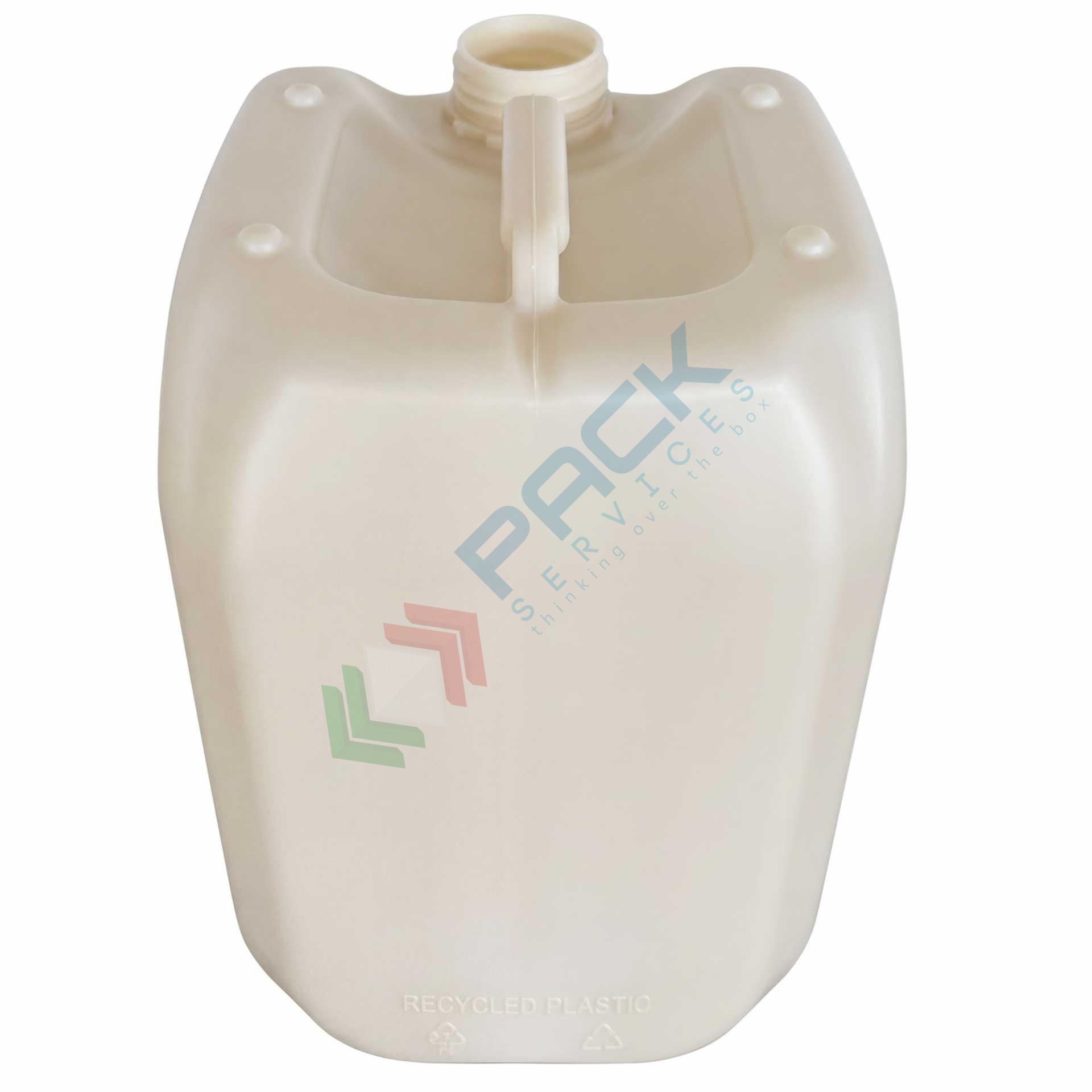 Tanica in plastica riciclata (65% HDPE rigenerato + 35% HDPE vergine), capacità 10 Lt, peso 430 gr, omologata ADR/ONU, tappo a vite DIN 51 con sigillo (escluso), colore neutro