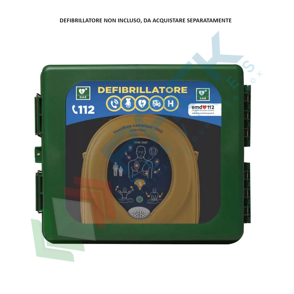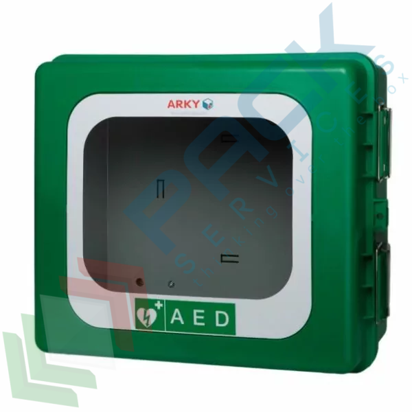 Armadietto impermeabile per defibrillatori DAE con allarme, riscaldamento ed alimentazione a bassa tensione, Mis. 340 L x 400 P x 200 H mm, ideale per ambienti esterni. La teca per defibrillatore è ideale per la collocazione del defibrillatore in ambienti esterni, dove è di fondamentale importanza garantire condizioni di conservazione consone al mantenimento del defibrillatore "ready to use". L'armadietto DAE garantisce totale protezione dal contatto con liquidi e sporco. Dispositivo salvavita. La teca per DAE dispone di un elemento interno riscaldante, funzionante a bassa tensione da 24V. Alimentatore compreso nella dotazione. L'armadio per DAE permette la conservazione del defibrillatore in presenza di condizioni climatiche estreme, con temperature compreso tra -10°C e + 50°C. Colore verde.