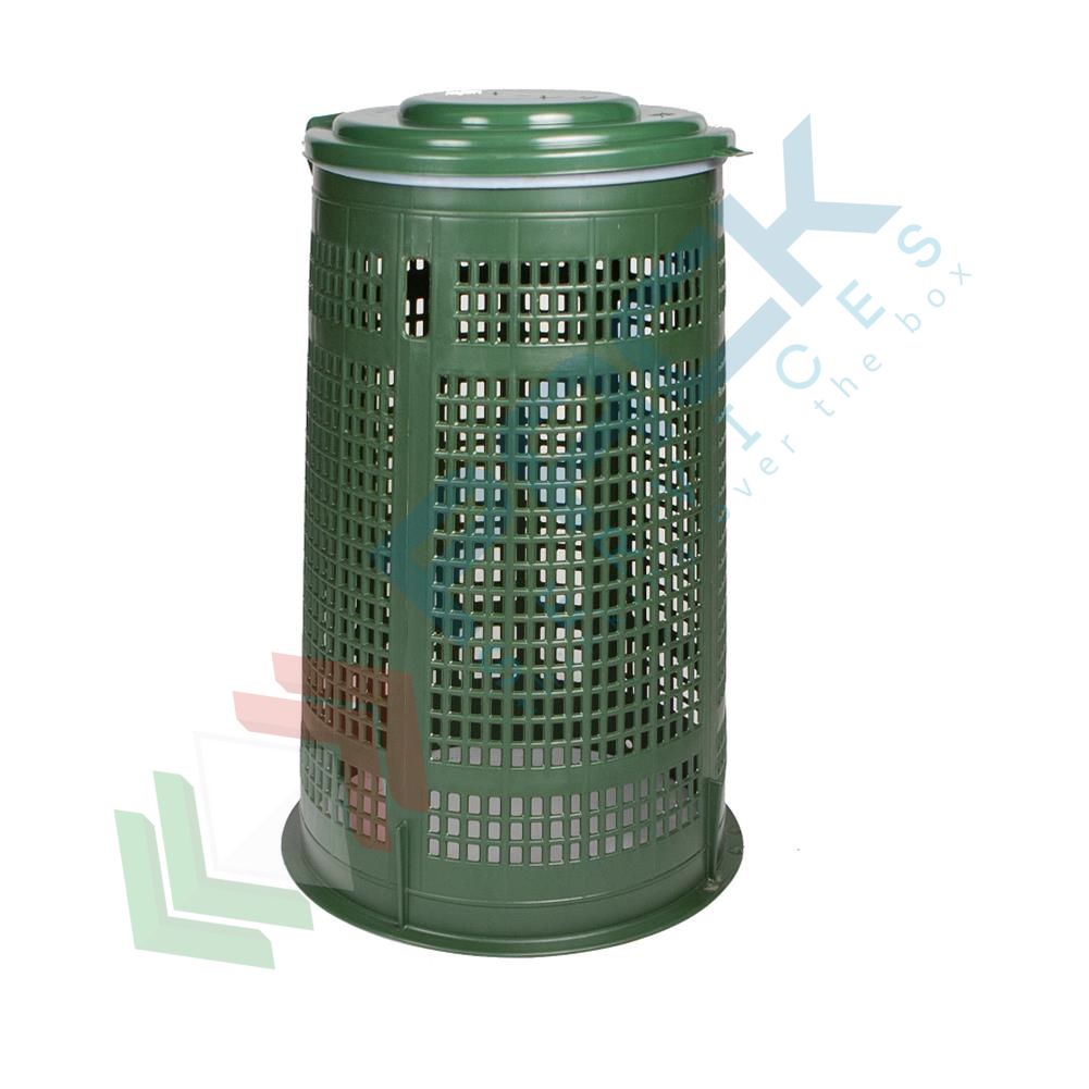 Trespolo immondizia ideale per la raccolta differenziata rifiuti, coperchio con cerniera e anello portasacco, capacità 130 Litri, Mis. Ø 430 x 870 H mm. Trespolo leggero e facilmente sollevabile, pratico e semplice da utilizzare, lavabile e sterilizzabile. Trespolo per rifiuti estremamente versatile per ogni tipo di rifiuto perchè prevede l’utilizzo del sacco raccogli immondizia, che viene fissato tramite l’anello ferma-sacco. Trespolo costruito in plastica (polipropilene 100% copolimero neutro masterizzato). Bidone raccolta differenziata impilabile anche con coperchio montato, occupa poco spazio in altezza. Il trespolo per rifiuti con coperchio sorregge un sacco di polietilene, definito "tipo condominiale", per la raccolta dei rifiuti domestici o assimilabili. Trespolo per la raccolta differenziata dei rifiuti con corpo e coperchio verde.