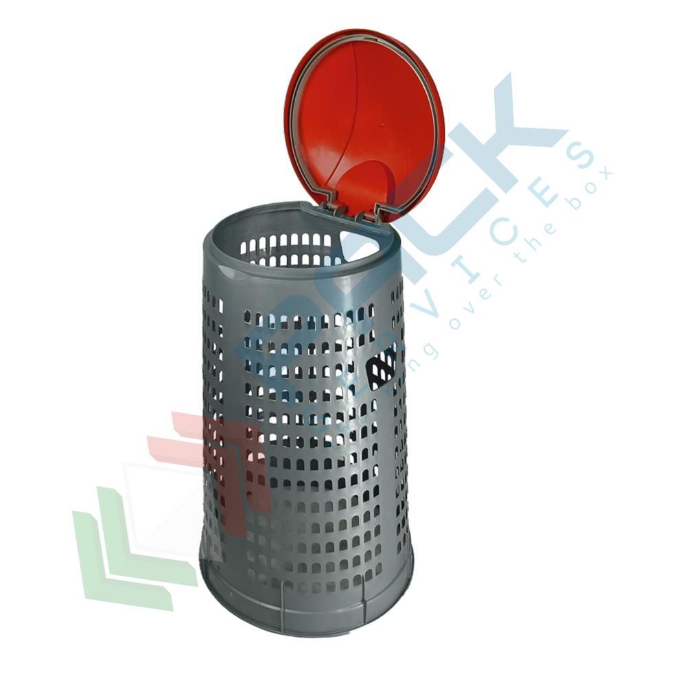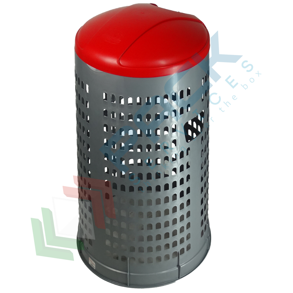 Trespolo immondizia ideale per la raccolta differenziata rifiuti, coperchio con cerniera e anello portasacco, capacità 110 Litri, Mis. Ø 380 x 800 H mm, Mis. base Ø 500 mm, altezza coperchio da aperto 380 mm. Trespolo leggero e facilmente sollevabile, pratico e semplice da utilizzare, lavabile e sterilizzabile. Trespolo per rifiuti estremamente versatile per ogni tipo di rifiuto perchè prevede l’utilizzo del sacco raccogli immondizia, che viene fissato tramite l’anello ferma-sacco. Trespolo ecologico, costruito in plastica (polipropilene 100% riciclabile). Bidone raccolta differenziata impilabile anche con coperchio montato, occupa poco spazio in altezza. Il trespolo per rifiuti con coperchio sorregge un sacco di polietilene, definito "tipo condominiale", per la raccolta dei rifiuti domestici o assimilabili dalle dimensioni cm. 70 x 110. Trespolo per la raccolta differenziata dei rifiuti con corpo grigio e coperchio rosso.