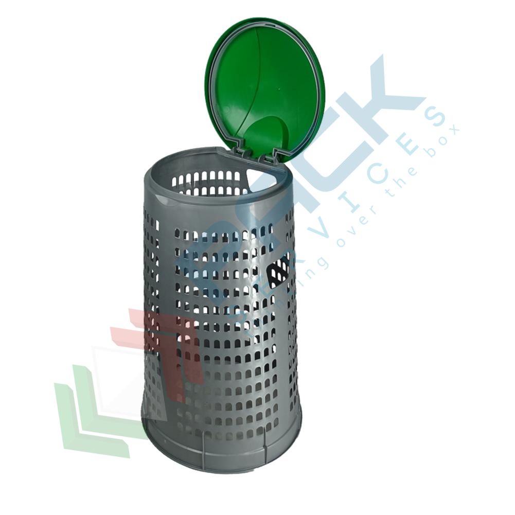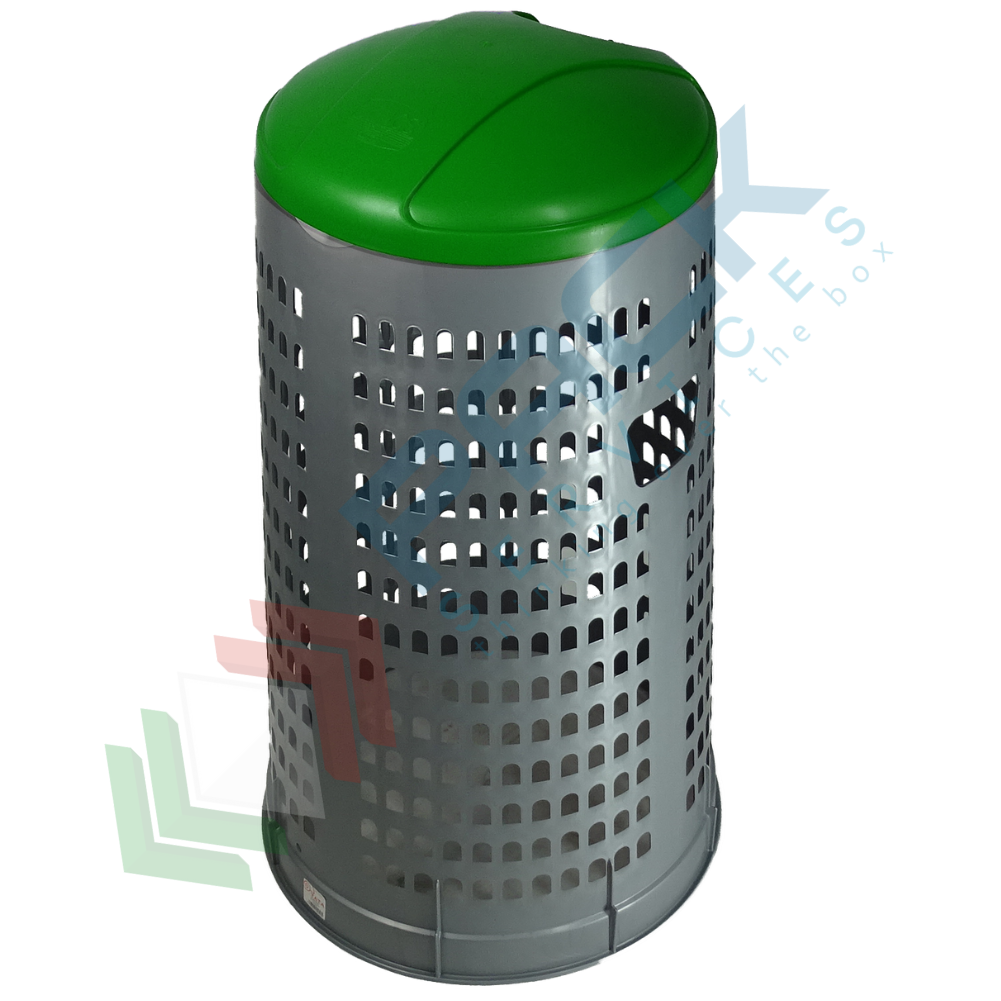 Trespolo immondizia ideale per la raccolta differenziata rifiuti, coperchio con cerniera e anello portasacco, capacità 110 Litri, Mis. Ø 380 x 800 H mm, Mis. base Ø 500 mm, altezza coperchio da aperto 380 mm. Trespolo leggero e facilmente sollevabile, pratico e semplice da utilizzare, lavabile e sterilizzabile. Trespolo per rifiuti estremamente versatile per ogni tipo di rifiuto perchè prevede l’utilizzo del sacco raccogli immondizia, che viene fissato tramite l’anello ferma-sacco. Trespolo ecologico, costruito in plastica (polipropilene 100% riciclabile). Bidone raccolta differenziata impilabile anche con coperchio montato, occupa poco spazio in altezza. Il trespolo per rifiuti con coperchio sorregge un sacco di polietilene, definito "tipo condominiale", per la raccolta dei rifiuti domestici o assimilabili dalle dimensioni cm. 70 x 110. Trespolo per la raccolta differenziata dei rifiuti con corpo grigio e coperchio verde.