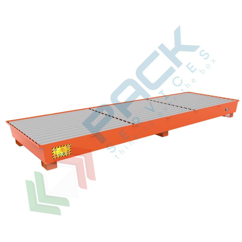 Vasca di contenimento conica in acciaio ideale per 3 cisterne IBC, volume di raccolta 1150 Lt, Mis. 4000 L x 1325 P x 345 H mm, colore arancio RAL 2004