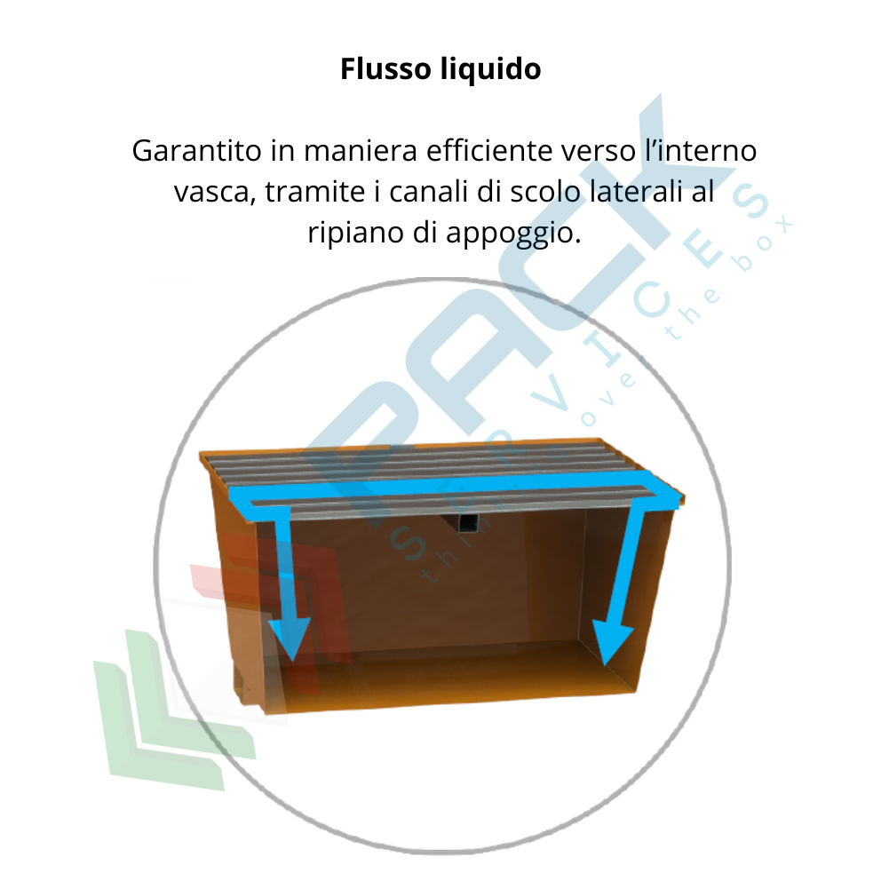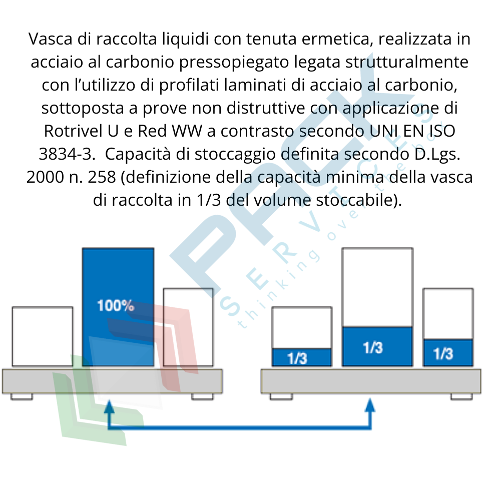 Vasca di raccolta liquidi in acciaio, ideale per lo stoccaggio in sicurezza di 3 cisterne IBC 1000 Lt da posizionare direttamente su grigliato in lamiera facilmente smontabile con elevata resistenza a flessione grazie al profilo grecato. Vasca di contenimento liquidi con Mis. 4000 L x 1325 P x 345 H mm, volume di raccolta 1150 Lt, portata ripiano 3000 Kg, realizzata in acciaio al carbonio verniciato, obbligatoria come previsto dal D. Lgs. N.81/2008 che prevede l'utilizzo di una vasca raccolta liquidi se stoccati liquidi infiammabili o inquinanti. Grazie ai piedini d'appoggio, la vasca di contenimento può essere movimentata all'interno di aree di lavoro con transpallet o muletti con la massima facilità. Flusso liquido garantito in maniera efficiente verso l’interno vasca, tramite i canali di scolo laterali al ripiano di appoggio. Impilaggio delle vasche per un’ottimizzazione del trasporto. Vasca di sicurezza che permette di collocare il supporto inclinato Cod. Art. SP-IBC per realizzare facilmente travasi e dosaggi e di svuotare completamente la cisternetta. Vasca di stoccaggio ideale per il contenimento di liquidi, oli, vernici, soluzioni alcaline, carburante, olio esausto, solventi, diluenti, sostanze chimiche, infiammabili impiegate nei processi industriali e nei laboratori. La vasca di stoccaggio viene utilizzata per prevenire eventuali sversamenti di sostanze pericolose ed inquinanti negli ambienti di lavoro o all'interno di falde acquifere ed eventuali danni alla salute dei lavoratori. Colore arancione RAL 2004.
