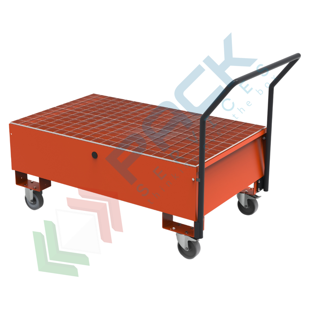 Vasca di contenimento liquidi carrellata, in acciaio ideale per 2 fusti, volume di raccolta 200 Lt, Mis. 1300 L x 800 P x 392 H mm, colore arancio RAL 2004