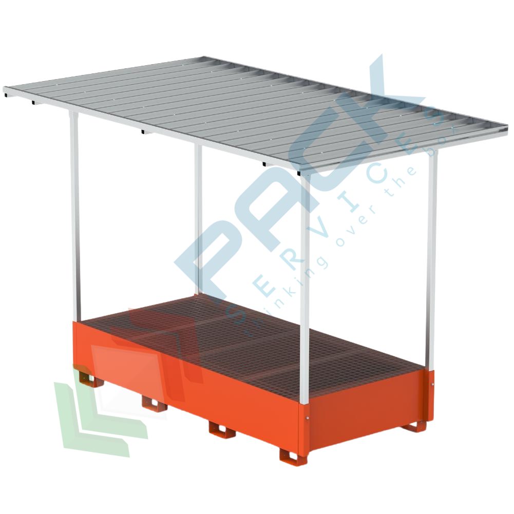 Vasca di contenimento liquidi in acciaio con tettoia smontabile, volume di raccolta 1400 Lt, ideale per 2 cisterne IBC, Mis. 2790 L x 1300 P x 2180 H mm, colore arancio RAL 2004