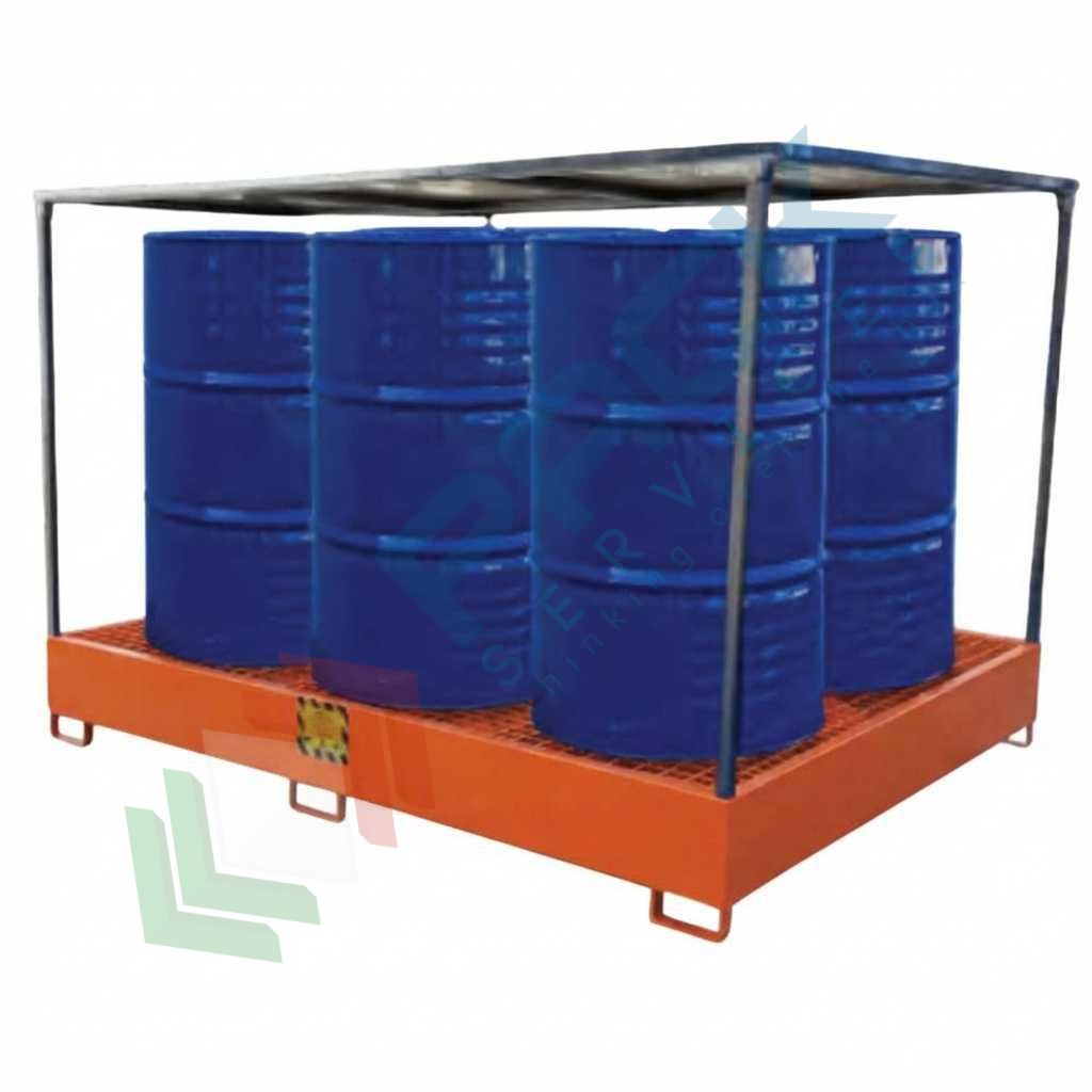 Vasca di contenimento liquidi in acciaio con tettoia, volume di raccolta 375 Lt, ideale per 6 fusti, Mis. 2000 L x 1250 P x 1600 H mm, colore arancio RAL 2004