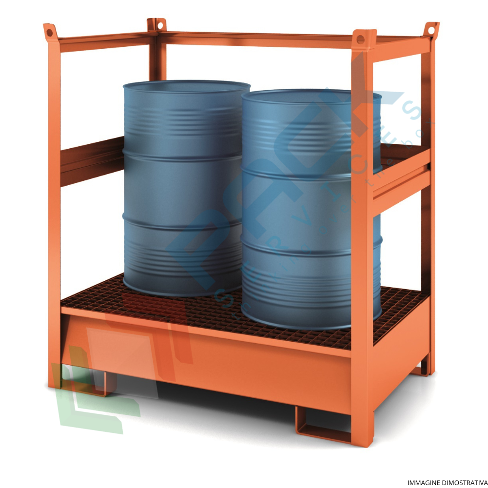Vasca di raccolta in acciaio con sponde laterali anticaduta, ideale per 2 fusti da 200 lt, utilizzata per prevenire eventuali sversamenti di sostanze pericolose ed inquinanti negli ambienti di lavoro o all'interno di falde acquifere. La vasca di contenimento con barriere laterali presenta Mis. 1350 L x 860 P x 1460 H mm ed è la soluzione ideale per l'organizzazione di aree di deposito in tutta sicurezza. Sistema di stoccaggio realizzato in acciaio al carbonio verniciato arancio RAL 2001. La vasca di raccolta è a tenuta stagna e il grigliato è realizzato in acciaio al carbonio zincato con maglie ad alta portata. Le pareti su tre lati garantiscono inoltre la massima sicurezza durante il trasporto all'interno dello stabilimento.