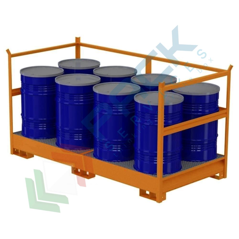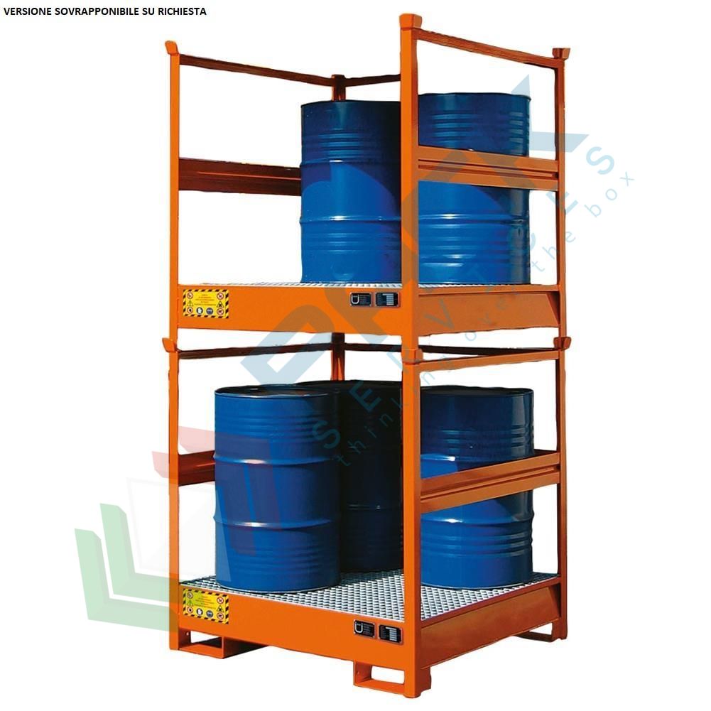Vasche di raccolta per fusti in acciaio dotate di sponde laterali anticaduta, utilizzate per prevenire eventuali sversamenti di sostanze pericolose ed inquinanti negli ambienti di lavoro o all'interno di falde acquifere. Le vasche di contenimento con barriere laterali per lo stoccaggio di fusti, sono la soluzione ideale per l'organizzazione di aree di deposito in tutta sicurezza. Questi sistemi di stoccaggio permettono lo stoccaggio di grandi quantità di materiali pericolosi con notevole risparmio di spazio. Le pareti su tre lati garantiscono inoltre la massima sicurezza durante il trasporto all'interno dello stabilimento. Versione sovrapponibile su richiesta.