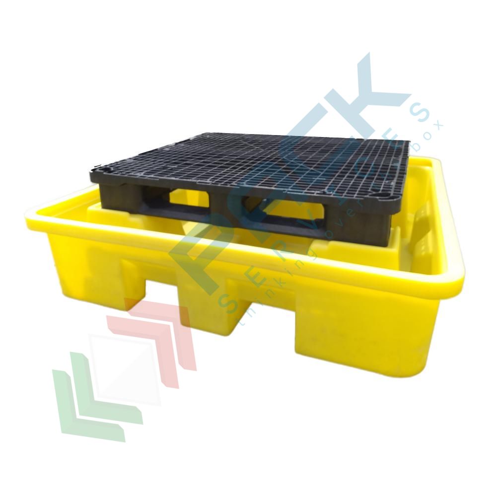 Vasca di sicurezza per lo stoccaggio di 4 fusti da 200 Lt realizzata in polietilene (PE) atossico stabilizzato U.V. di colore giallo, roto-stampata, monolitica ovvero stampata in unico pezzo senza giunzioni. Vasca di contenimento con Mis. 1550 L x 1600 P x 360 H mm, portata massima 1000 Kg (statico uniformemente distributo). Vasca di sicurezza con struttura auto portante e rinforzata per resistere agli urti, resistente agli agenti chimici e dotata di una griglia di appoggio in polipropilene (PP) Mis. 1200 x 1200 mm. Vasche di contenimento impilabili.