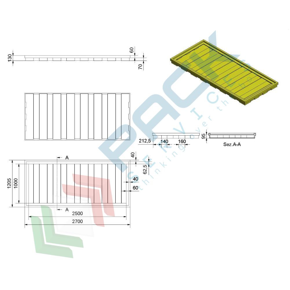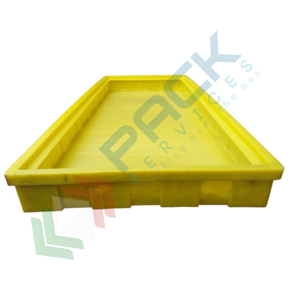 Vasca di raccolta liquidi realizzata in polietilene (PE), ideale per sotto scaffalatura, Mis. 2700 L x 1205 P x 130 H mm, capacità 400 Lt. Vasca di contenimento ideale per essere posizionata sotto la scaffalatura per un ulteriore contenimento di eventuali sversamenti di liquidi da contenitori, fusti, cisterne. La vasca di raccolta è realizzata in polietilene ecologico (PE) ideale per resistere agli agenti chimici e corrosivi, con stampaggio rotazionale, monoblocco. La vasca di stoccaggio per sottoscaffalatura è molto resistente e può essere impilato garantendo la massima robustezza e versabilità. Vasca di contenimento a pavimento resistente ad acidi, oli, chimici e molto altro, utili per la protezione dell'ambiente di lavoro, dell'ambiente e del personale. Colore giallo.