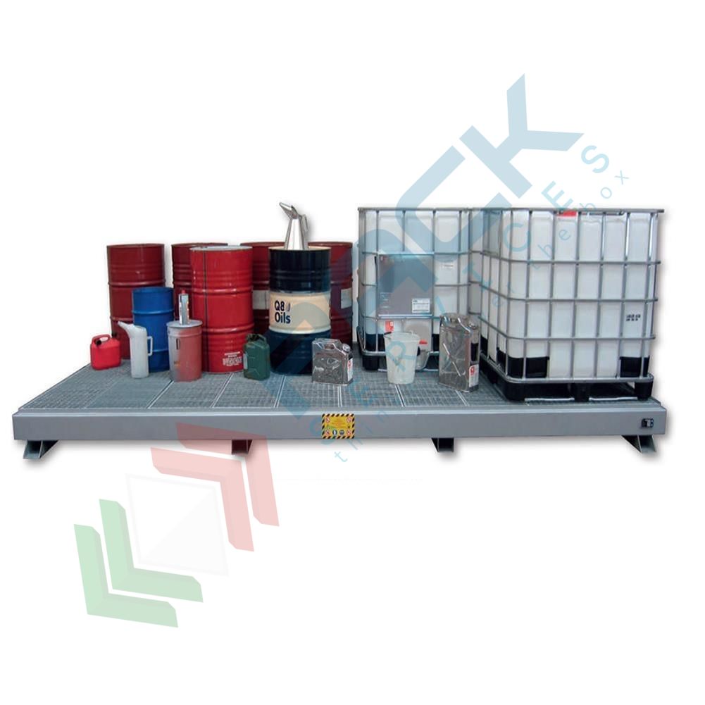Vasche di raccolta realizzate in acciaio al carbonio chepermettono di creare superfici di carico fino ad 11 m2. Vasche di contenimento ideali per stoccare fusti, cisternette o piccoli contenitori ad elevato potere di carico e di raccolta; Ottimali per realizzare aree di prelievo sicure, prevengono sversamenti accidentali. Le vasche di sicurezza proteggono le falde acquifere in caso di sversamenti accidentali di sostanze pericolose ed inquinanti. Questo sistema secondario di contenimento è in grado di prevenire e ridurre situazioni potenzialmente inquinanti. Colore grigio RAL 7001.
